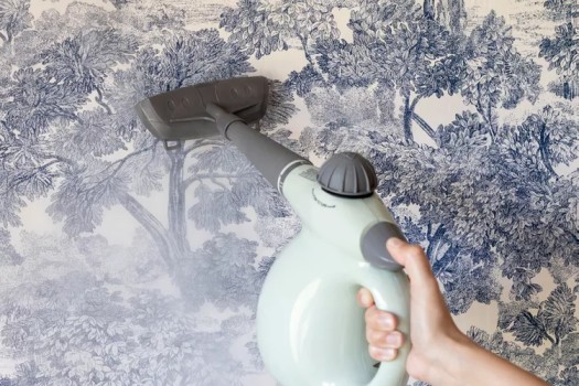 Menggunakan alat uap (steam cleaner) adalah cara efektif untuk melepas wallpaper yang memiliki daya rekat kuat atau sudah lama menempel. Uap panas akan melunakkan lapisan perekat sehingga lebih mudah dilepaskan tanpa merusak dinding. Isi steam cleaner dengan air sesuai petunjuk penggunaan, nyalakan dan tunggu beberapa menit hingga uap terbentuk. Arahkan alat uap ke permukaan wallpaper dari bagian tepi ke tengah, dan tahan beberapa detik pada setiap bagian agar perekat melunak.
