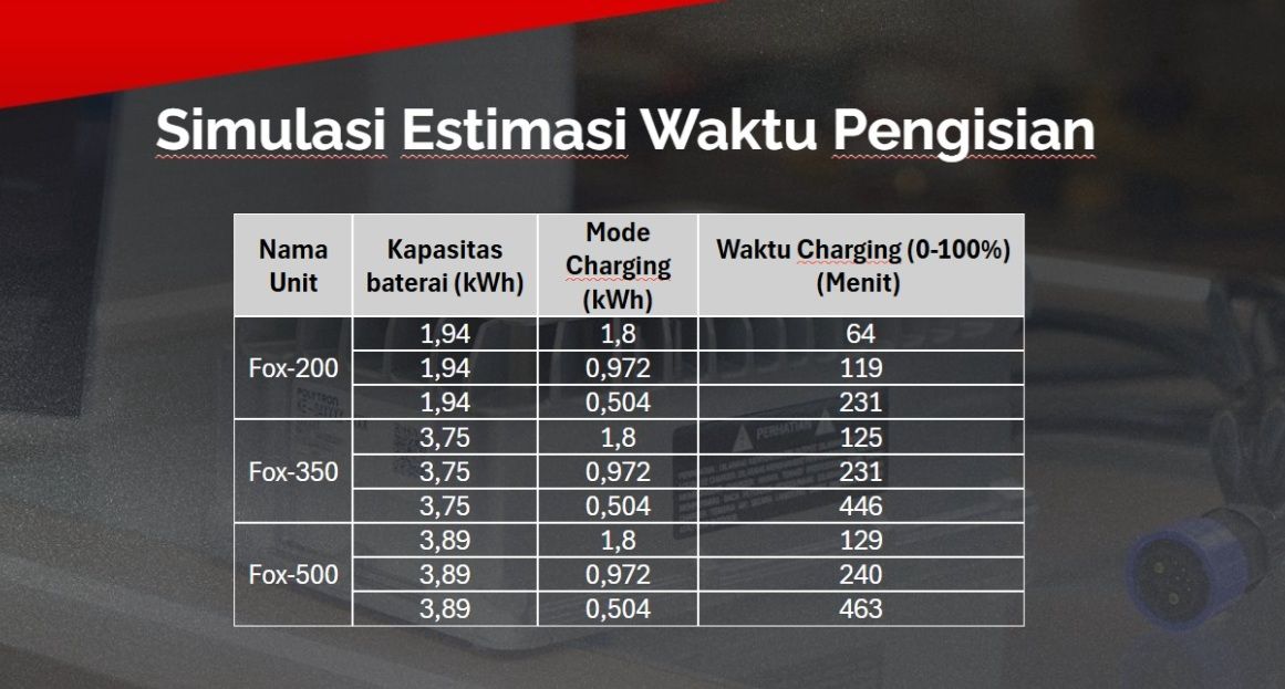 Keunggulan utama lain dari produk ini adalah fitur Adjustable Ampere, yang memungkinkan pengguna menyesuaikan kebutuhan pengisian daya sesuai kondisi dan waktu perjalanan. Tersedia tiga mode pengisian, yaitu Fast (72V 25A), Normal (72V 13,5A), dan Slow (72V 7A). Dengan mode fast charging, pengguna FOX Electric dapat memperoleh jarak tempuh tambahan hingga 10 km hanya dalam 10 menit pengisian untuk FOX-350, serta hingga 20 km dalam 15 menit untuk FOX-200.