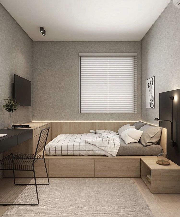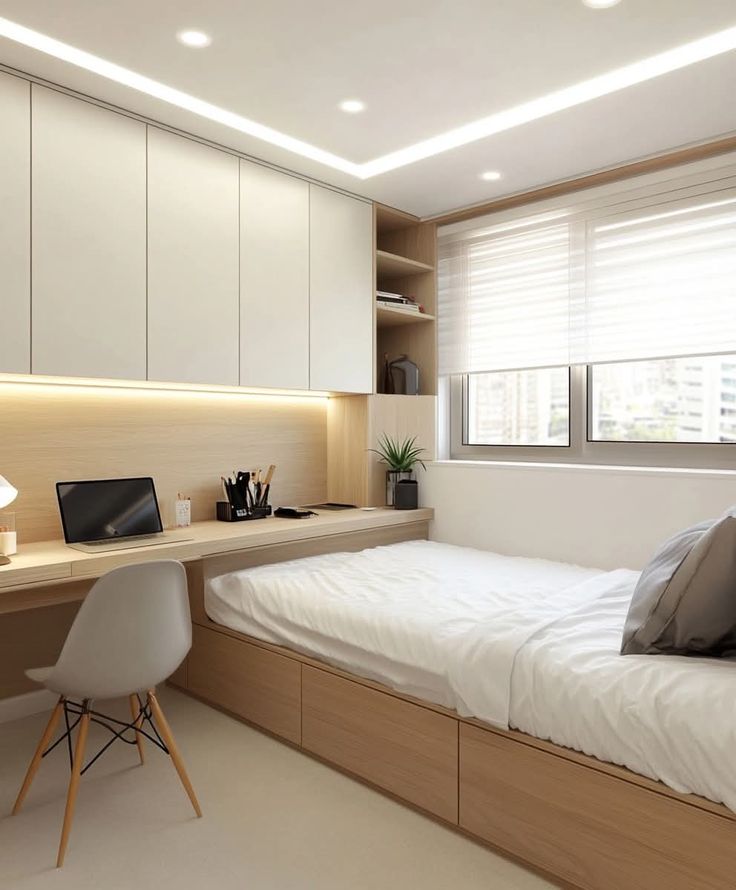 Salah satu prinsip utama dalam mendesain kamar kecil adalah menjaga tampilan ruang tetap sederhana dan tidak terlalu penuh. Konsep minimalis sering menjadi pilihan karena mampu menciptakan kesan ruang yang lebih lega. Penggunaan warna terang seperti putih, krem, atau pastel dapat membantu memantulkan cahaya sehingga kamar terlihat lebih luas. Warna-warna ini juga memberikan kesan bersih dan menenangkan.