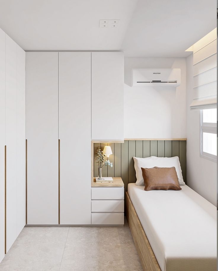 Desain ini mengutamakan kesederhanaan dengan warna netral dan furnitur minimal. Tampilan kamar terlihat rapi dan bersih sehingga terasa lebih luas.