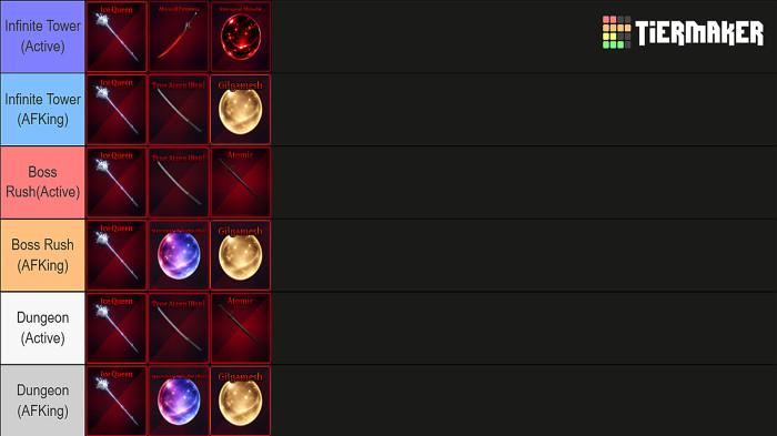 Senjata dengan damage tinggi tidak terlepas dari fungsi masing-masing karena keunggulan yang dimilikinya. Aktivitas seperti Infinite Tower, Boss Rush, dan Dungeon memerlukan senjata yang cocok sehingga efektif dalam eksekusinya. Jika melihat dari tier list yang terpapar di atas, Ice Queen menempati di seluruh kolom tier list dalam kegunaannya di aktivitas. Hal ini dipertegas oleh pemain ahli @kailer_rais2008 dalam pernyataannya bahwa Ice Queen unggul dalam banyak hal.