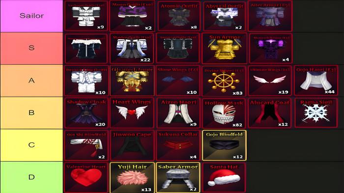 Pada Tier C dan D, umumnya diisi oleh item yang sifatnya “apa adanya”. Aksesori di kelas ini cenderung tidak jadi prioritas utama karena nilai bonus statistiknya belum sebesar item tier atas. Buat pemain yang sedang mulai main Sailor Piece, aksesori di kelas ini biasanya menjadi batu loncatan untuk ke tier selanjutnya. Contoh di Tier C dan D ini ada Qin Shi Blindfold, Jinwoo Cape, Sukuna Collar, dan Gojo Blindfold.