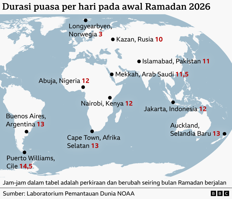 Bulan suci Ramadan bagi umat Islam akan dimulai setelah matahari terbenam pada Selasa, 17 Februari atau Rabu, 18 Februari—tergantung lokasinya di dunia. Tanggal pasti Ramadan berubah setiap tahun karena Islam menggunakan kalender berdasarkan siklus Bulan. Umumnya, Ramadan bergeser mundur sekitar 11 hari dalam kalender dari satu tahun ke tahun berikutnya.