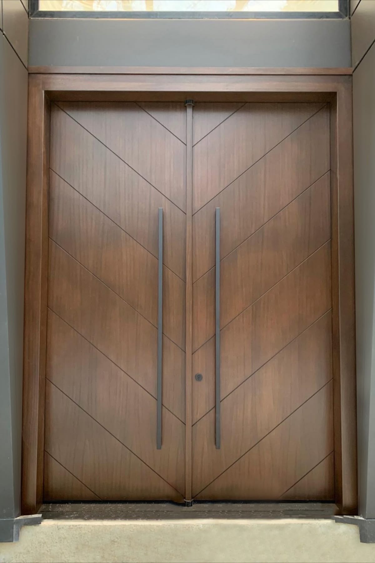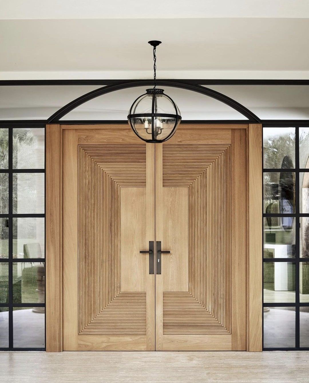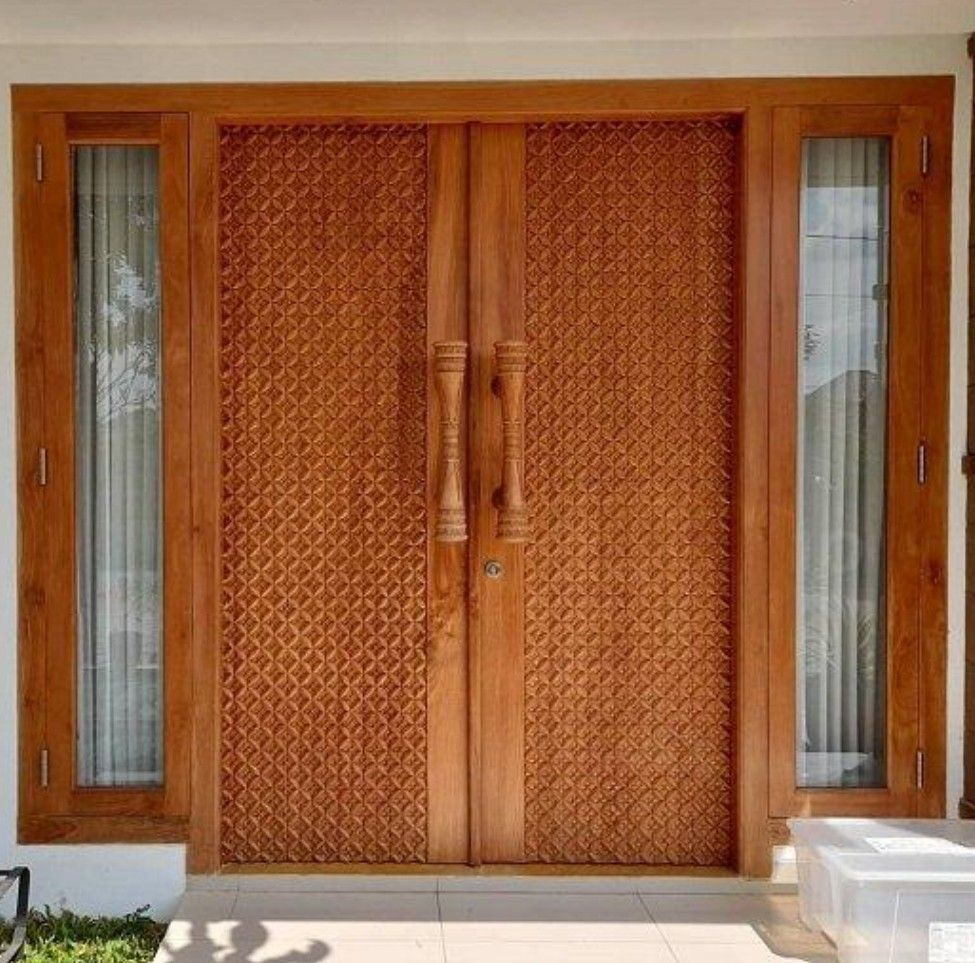 Material kayu solid dengan finishing natural memberikan kesan hangat sekaligus mewah pada pintu utama rumah.Pintu Kupu Tarung Motif Geometris Modern