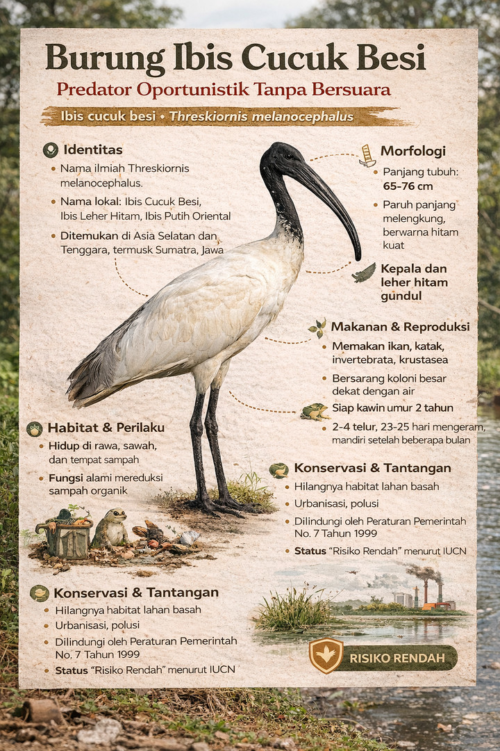 Julukan “predator oportunistik tanpa bersuara” bukan metafora kosong. Ia mencerminkan cara hidup yang efisien, adaptif, dan fungsional. Ibis cucuk besi adalah simbol ketahanan biologis di tengah perubahan lingkungan.
