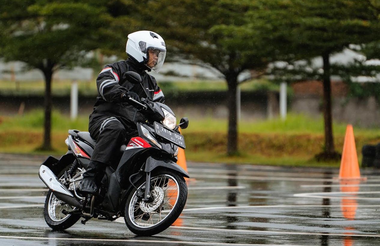 Jalanan basah cenderung licin, maka dari itu pastikan alur ban (tread) masih tebal agar mampu membuang air dengan baik. Juga, jaga tekanan angin sesuai standar pada buku manual Honda agar traksi ban terhadap aspal tetap maksimal.