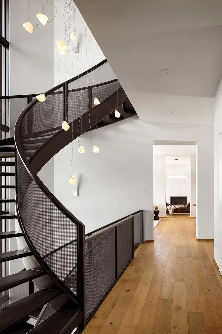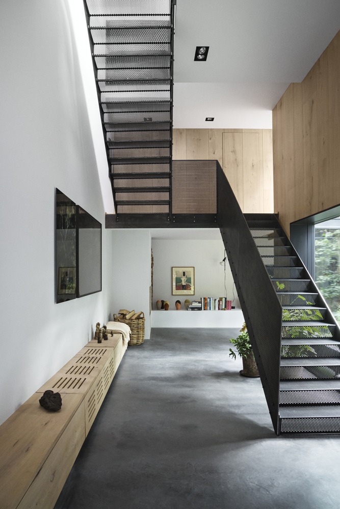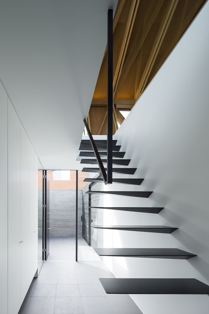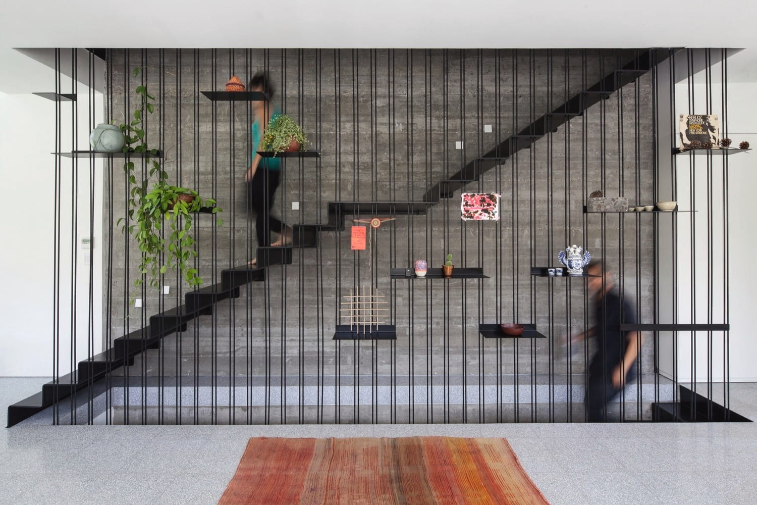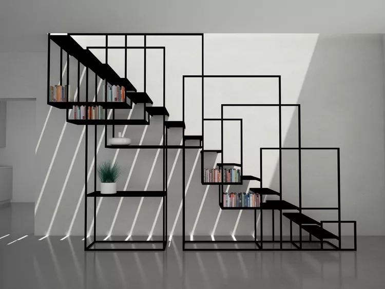 Pada desain ini, rangka besi tersembunyi di dalam dinding sehingga anak tangga terlihat seperti melayang.
