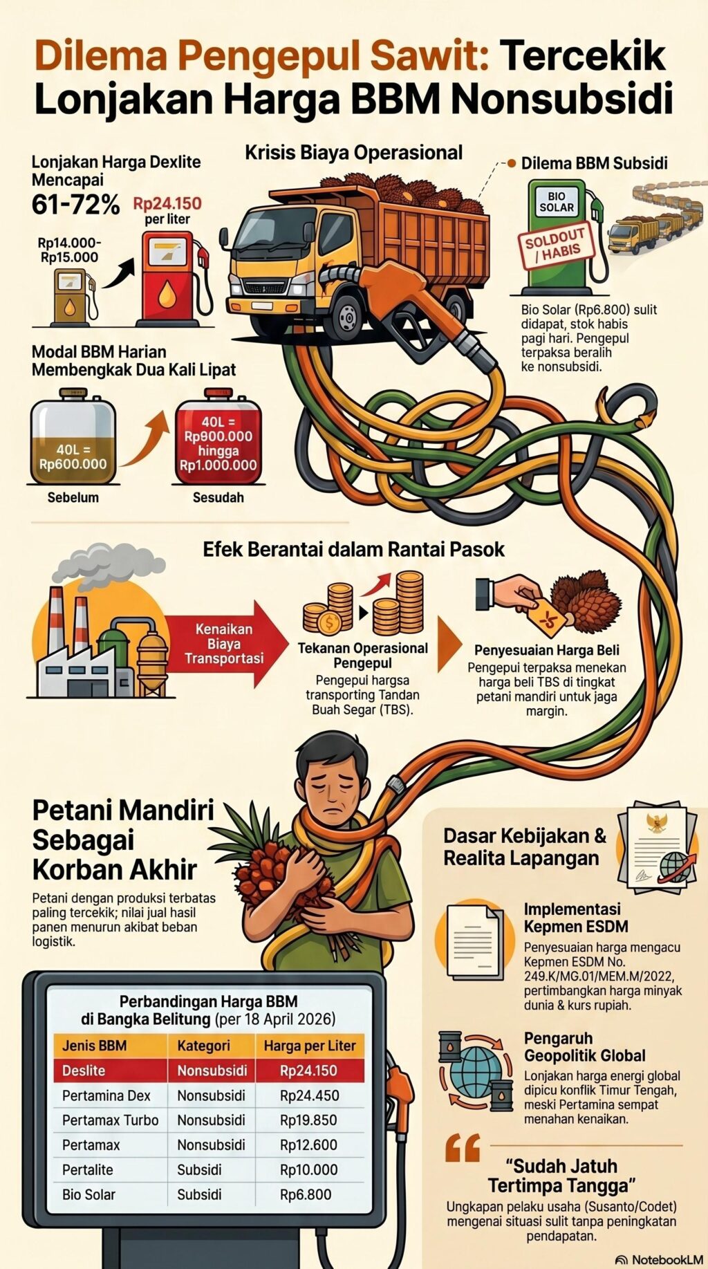Pada hari Sabtu (18/4/2026), telepon ponsel Susanto (35) tiba-tiba berdering. Panggilan tersebut datang dari sopir yang membawa truk milik Codet, sapaan akrabnya, ke Stasiun Pengisian Bahan Bakar Umum (SPBU). Sang sopir mengabarkan kenaikan harga Bahan Bakar Minyak (BBM) nonsubsidi jenis Dexlite.