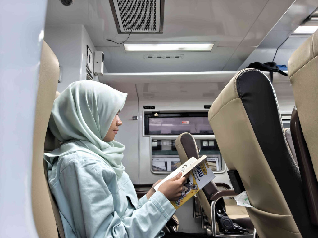 Saya memilih bangku di dekat jendela agar bisa melihat pemandangan dan memotret menggunakan handphone. Setelah menyimpan dua buah tas ke area bagasi, saya duduk dengan nyaman sambil mengeluarkan buku bacaan. Perjalanan kali ini memakan waktu sekitar 6 jam 8 menit, jadi pasti butuh aktivitas seru untuk menemani perjalanan.