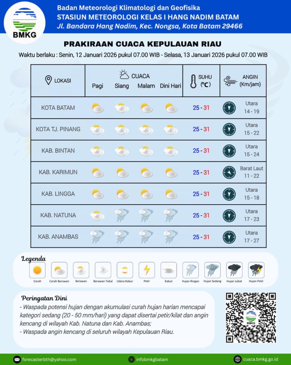 Berikut rincian prakiraan cuaca untuk beberapa wilayah di Kepri: