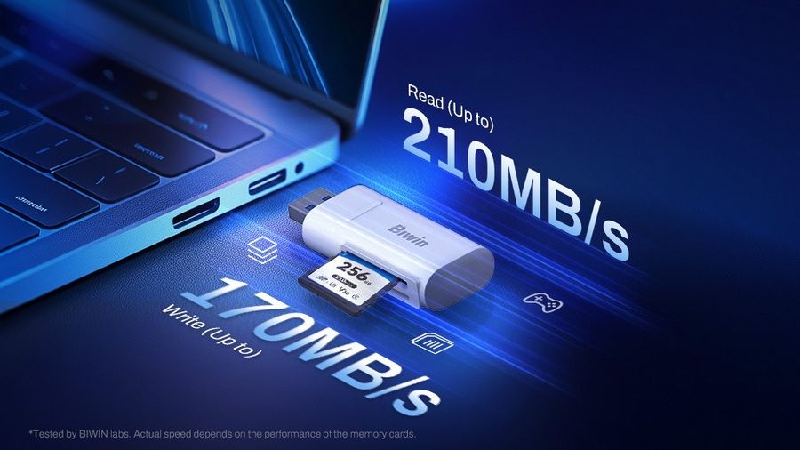 Untuk mempercepat proses pascaproduksi dan distribusi, Biwin menghadirkan RC210 SD/microSD Card Reader. Perangkat ini mendukung transfer simultan kartu SD dan microSD dengan teknologi USB 3.2 Gen 1, menghadirkan kecepatan hingga 5 Gbps.