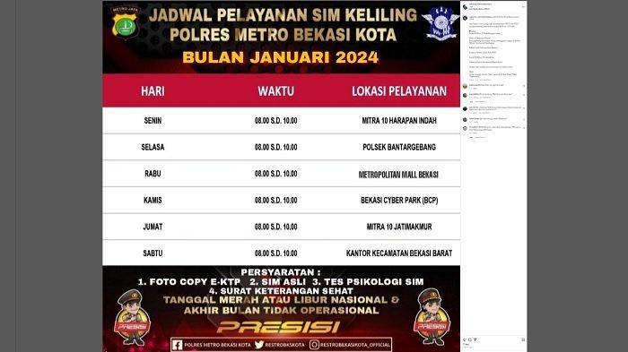Pada hari Senin (12/1/2026), layanan SIM Keliling Kabupaten Bekasi akan digelar di Polsek Setu dengan jam operasional pukul 10.00–13.00 WIB. Warga yang ingin memperpanjang SIM dapat mengikuti prosedur yang telah ditentukan. Syarat utama yang harus dipenuhi adalah melampirkan E-KTP, SIM lama, surat keterangan sehat, dan hasil tes psikologi.